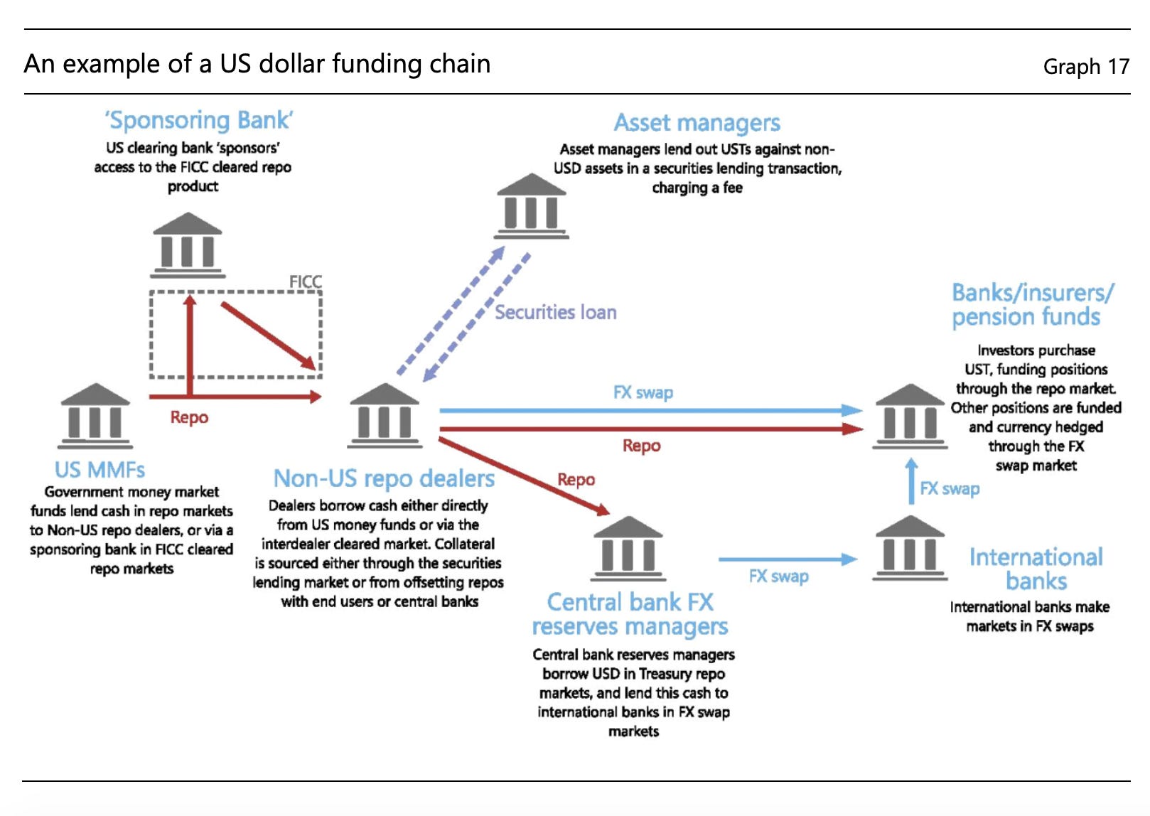 Borrowers and lenders of US dollars usually rely on intermediaries. A characteristic of international US dollar funding markets is that they may involve several layers of intermediation that give rise to long and complex funding chains and result in significant interconnectedness for the financial system, more than in most domestic markets. Graph 17 provides illustrative examples where US MMFs act as ultimate lenders; non-US entities are the ultimate users of dollars; and non-US repo dealers, the FICC, central bank FX reserves managers and international banks act as intermediaries. These funding chains cut across jurisdictions and sectors, and add complexity. In addition, it is often the case that whole chains and their interconnections are not visible.