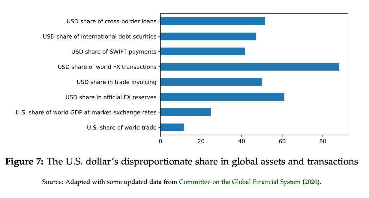 So when we metricate the scale of the dollar’s global reach by putting together a chart like this, which compares flows of global finance with national economic aggregates like shares of global GDP, we are engaged in a comparison of apples and oranges.
