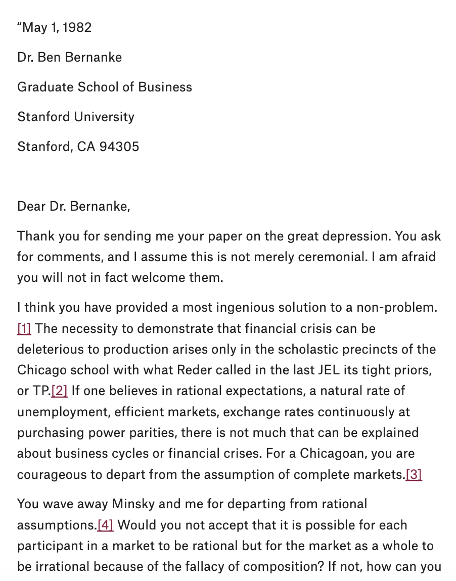 Kindleberger may not have lived long enough to analyze the latest generation of market-based finance. But in the 1980s he was very much alive and kicking. Indeed, he trained many of the cohort of macroeconomists at MIT to which Bernanke belonged. So, when the up-and-coming Ben Bernanke drafted the paper which is cited in the Nobel committee report - Non-Monetary Effects of the Financial Crisis in the Propagation of the Great Depression (1983) - he sent a copy to Kindleberger for comment. Miraculously, Perry Mehrling found Kindleberger’s reply in the archive and has published it on the INET platform.