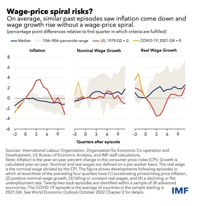 The BIS suggests as much. But in the latest issue of the World Economic Outlook, another team of high-powered mainstream economists, this time from the IMF, takes a look at the question of wage-price spirals and comes to rather different conclusions. The IMF find that apart from a few very unusual incidents, which they discuss at some length, there is, in fact, remarkably little systematic evidence that periods of rising inflation, rising nominal wages and falling real wages - our current situation - tend to develop into sustained spirals of wages and prices.