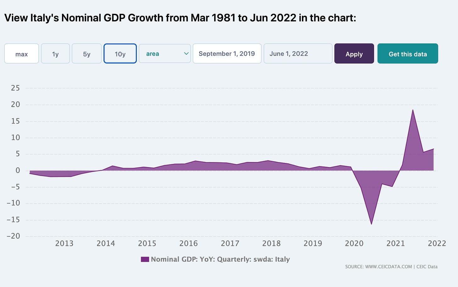 In light of the furious debates over debt sustainability since 2008, one might have expected more discussion of the extraordinary windfall (to tax payers) delivered by a surge in nominal GDP - a surge in the denominator of the debt/gdp ratio, or, in other words, a real devaluation of the public debt. In Italy, long seen as the weak link amongst the G7 economies, nominal GDP growth reached 7.919 percent in March 2022.