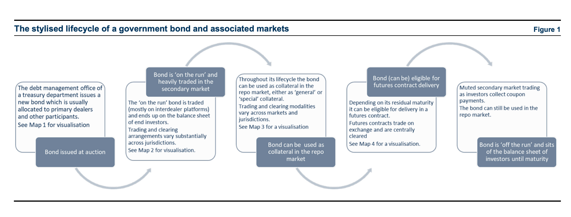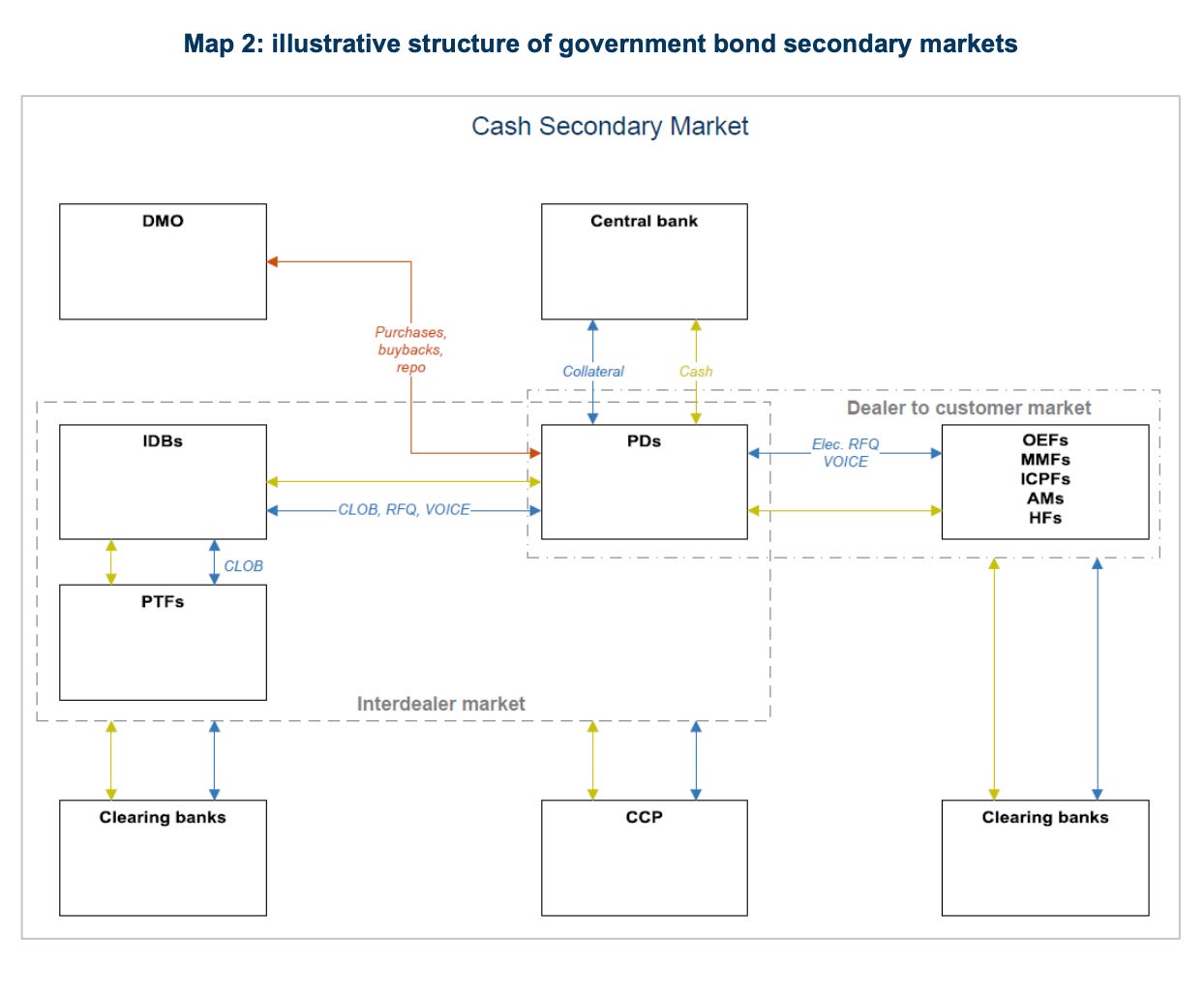 The system that has emerged is fragmented and unstable. The Financial Stability Board provides the following map for the secondary market, with further complexity added by repo and futures markets.