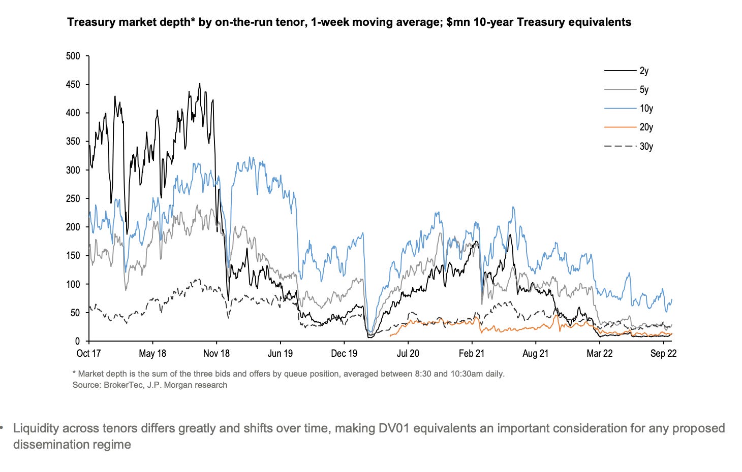 The market depth for US Treasuries varies by duration. It collapsed entirely in March 2020, but though it has recovered, it remains well below 2019 levels.