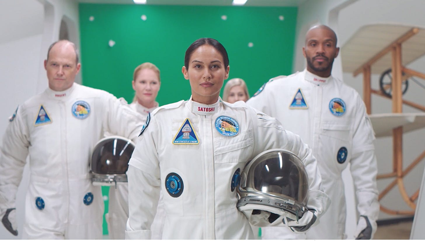 And a multi-ethnic group of astronauts featuring tell-tale reference to the mythic founder of bitcoin.