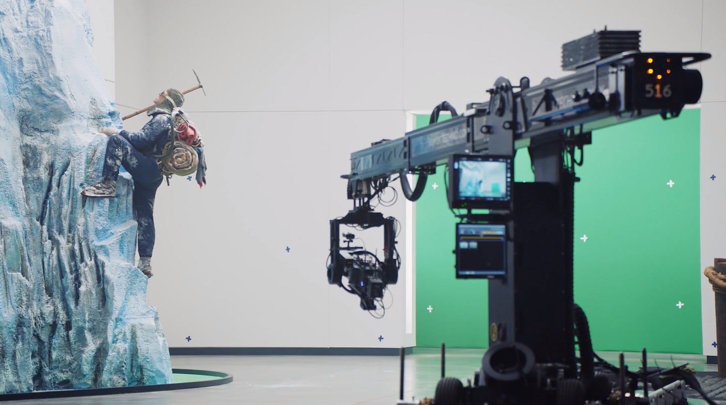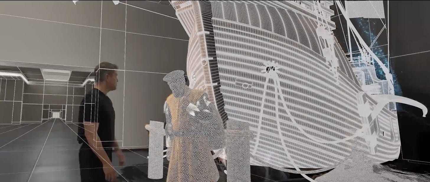 The film-makers describe how they construct a hybrid world of VFX and live action, in which Damon marches through an empty white hall - what they call “the museum of bravery” - in which images appear around him as examples of perseverance and bravery. These include a virtual renderings of Magellan-like figure ….