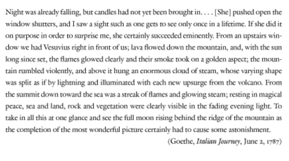 But Vesuvius does not belong only to the classical tradition. In the 18th century, the volcano would become one of the quintessential sites of the romantic sublime. Here is Goethe describing his first encounter with the volcano in 1787.