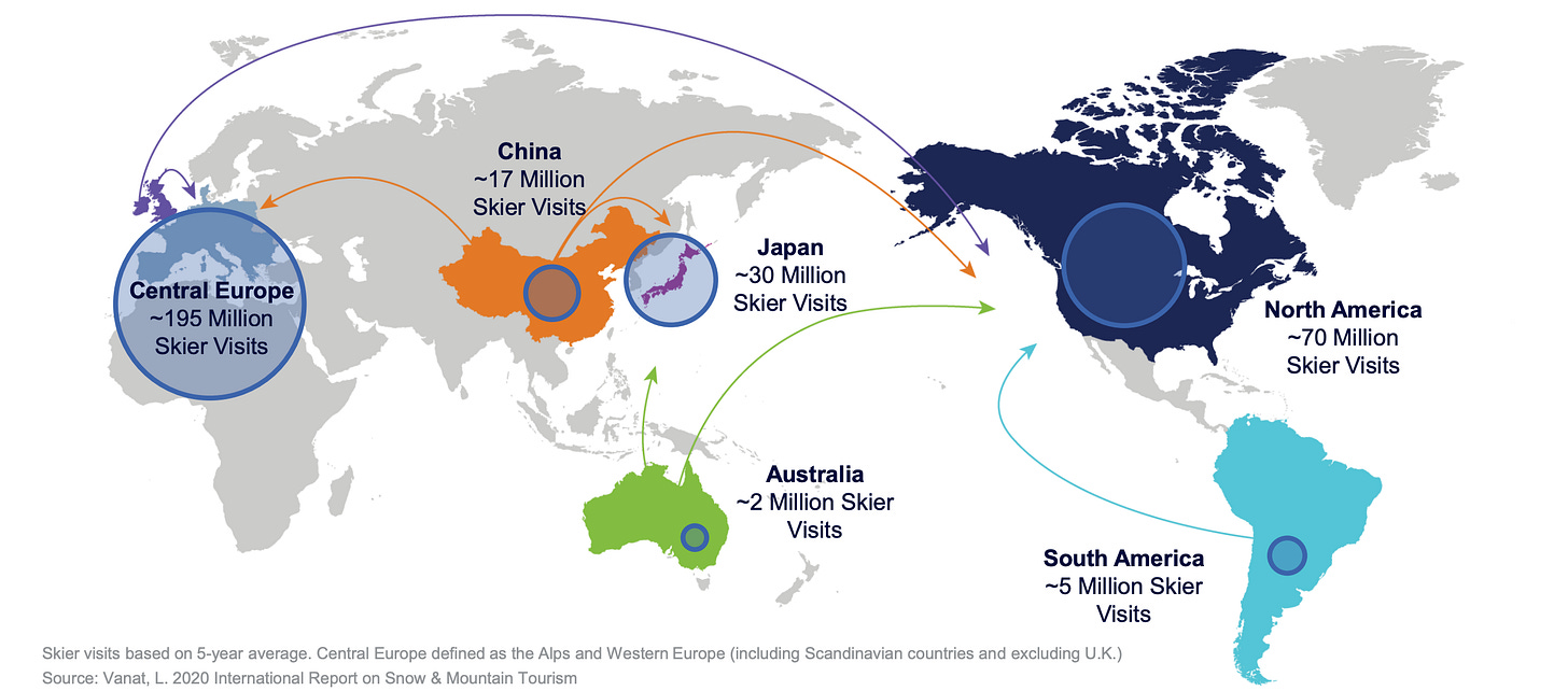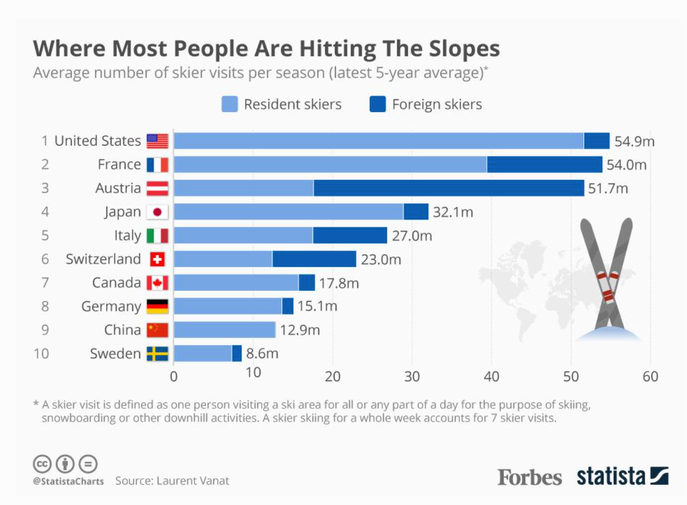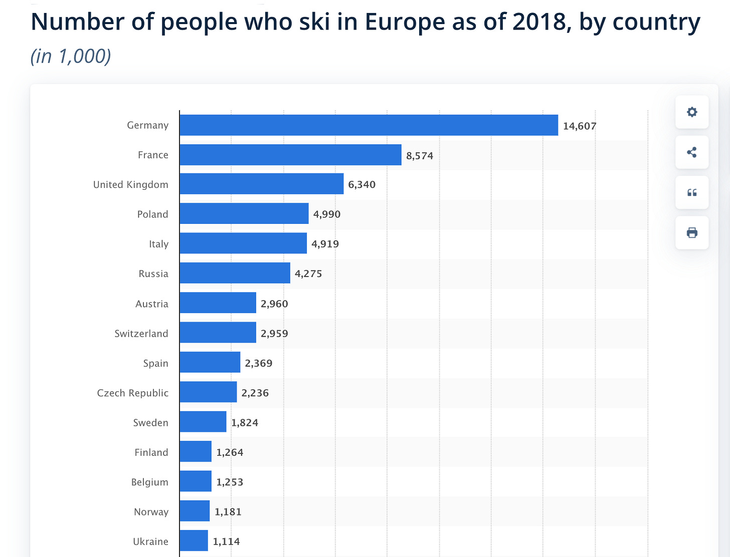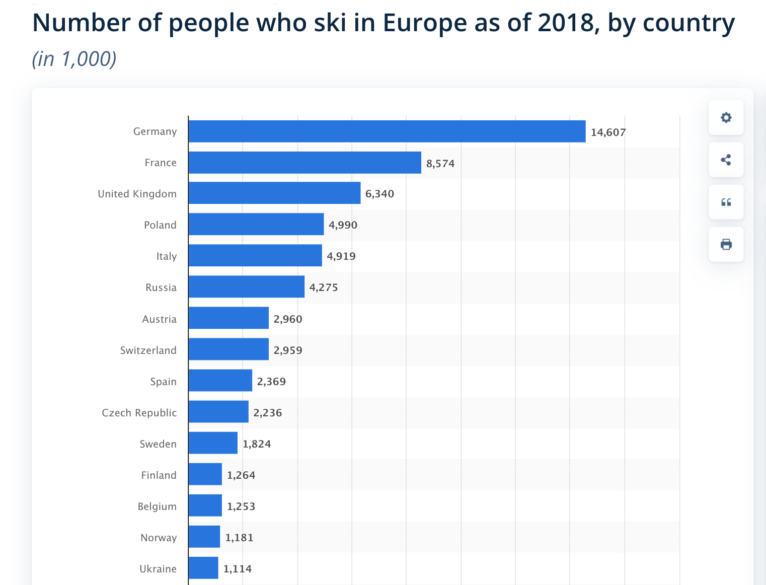 Of 8 billion total population worldwide, it is thought that about 135 million people regularly ski, so about 1.5 percent. There are c. 2000 alpine skiing destinations in the world with the vast majority in North America, Asia and above all Europe. Unsurprisingly, given that the cost of even a short skiing trip can easily run into many thousands of dollars per person - allowing for travel, lodgings, ski pass and equipment - skiers are an affluent group. Roughly 20 million of the world’s skiers in any one year are in the US, if you include snowboarders. 15 million or so come from Germany.