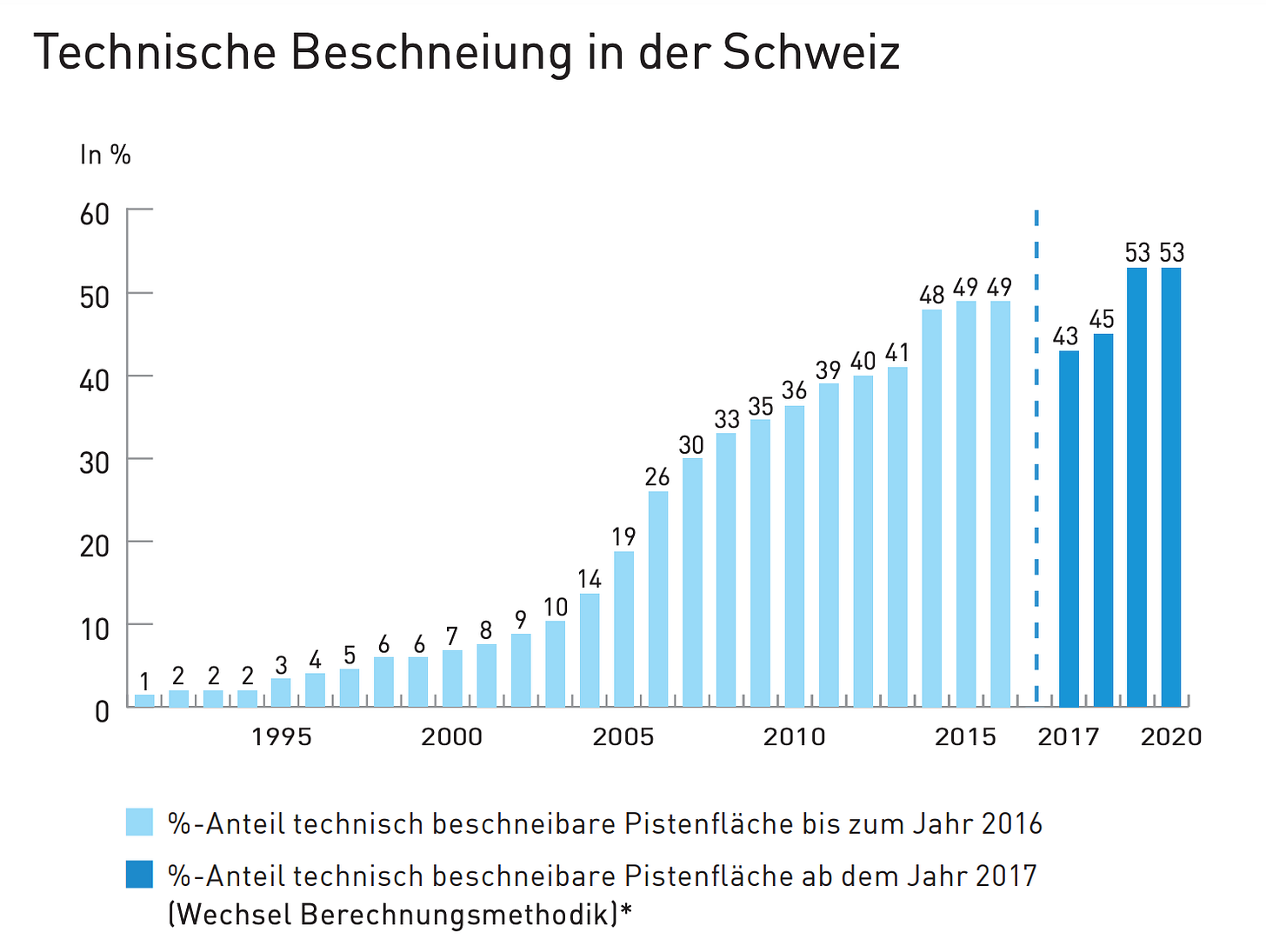 The first snow cannon was invented in the early 1950s and resorts in the Catskills became the first in the world regularly to use artificial snow. By the 1970s snow cannon were in widespread use in Europe as well and since the early 2000s there has been a huge surge. Here are the numbers for the share of Swiss slopes that can be provided with “technical snow”.