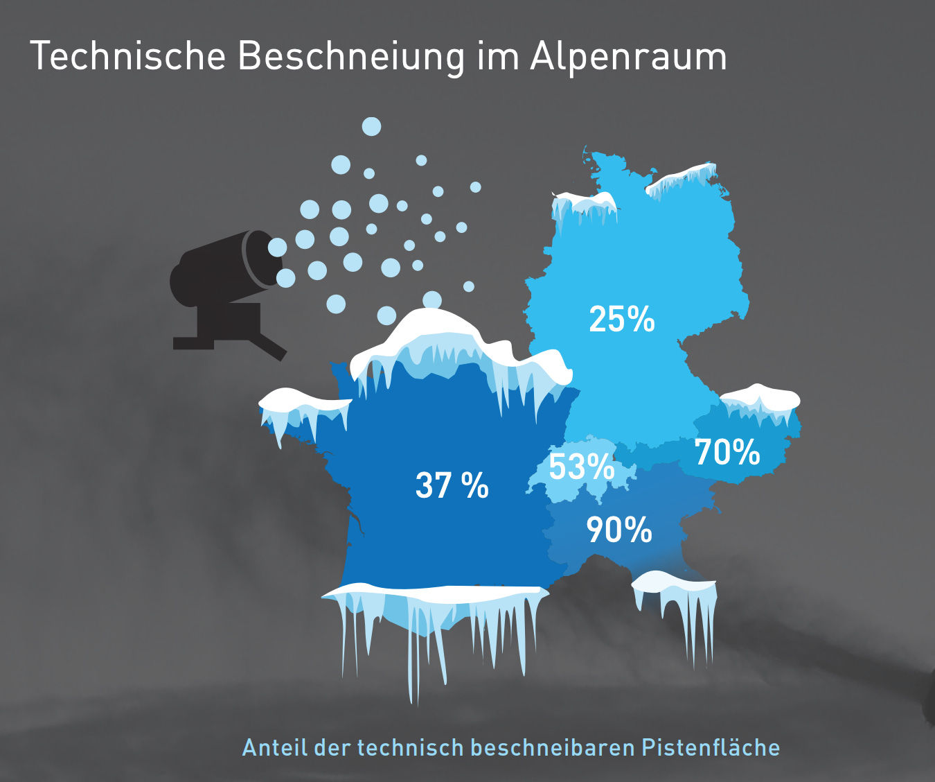Currently, Switzerland has a stable share of 50 percent of its slopes that are worth maintaining with artificial snow. That places it between the German and French slopes, which tend to rely on natural snowfall and the Italian Alps where snowmaking equipment was introduced in the 1980s and 90 percent of the slopes are today maintained with artificial snow.