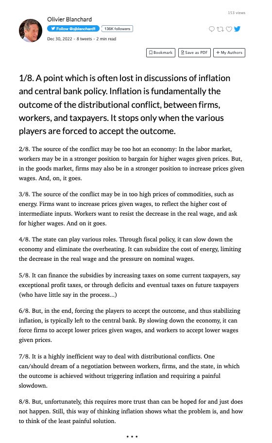 The hawkishness of recent comments from the ECB plus this scenario of agonizing and brutal efforts to squeeze inflation down from 3 to 2 percent may help to explain why Blanchard chose to end 2022 by launching a twitter thread, which has since kept the economics social media scene buzzing.