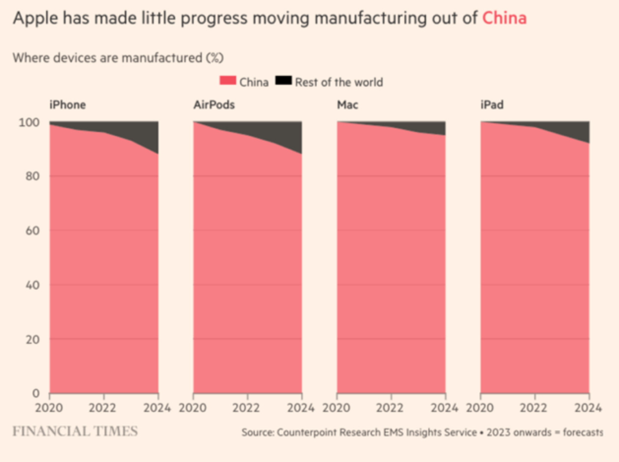 You could, for instance, cite the recent FT analysis which shows just how hard it is proving for Apple to disentangle itself from its Chinese supply chains.