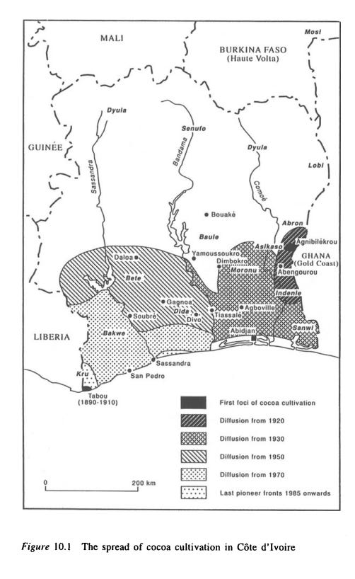 Across West Africa, the moving frontier of cocoa cultivation was a land grab akin to those which drove agrarian growth across South America, or, for instance, in Manchuria in East Asia. In this case the settlers were African peasants and the land they was incorporated into production were the West African forests. The great French historian and analyst of cocoa François Ruf speaks of the “forest rent” harvested by the cocoa farmers. Ruf sees the history of cocoa as driven by a series of “pioneer fronts” that have extended around the world from South America to Indonesia and West Africa. As William Gervase Clarence-Smith and Ruf explain in their introduction to the edited collection Cocoa Pioneer Fronts:
