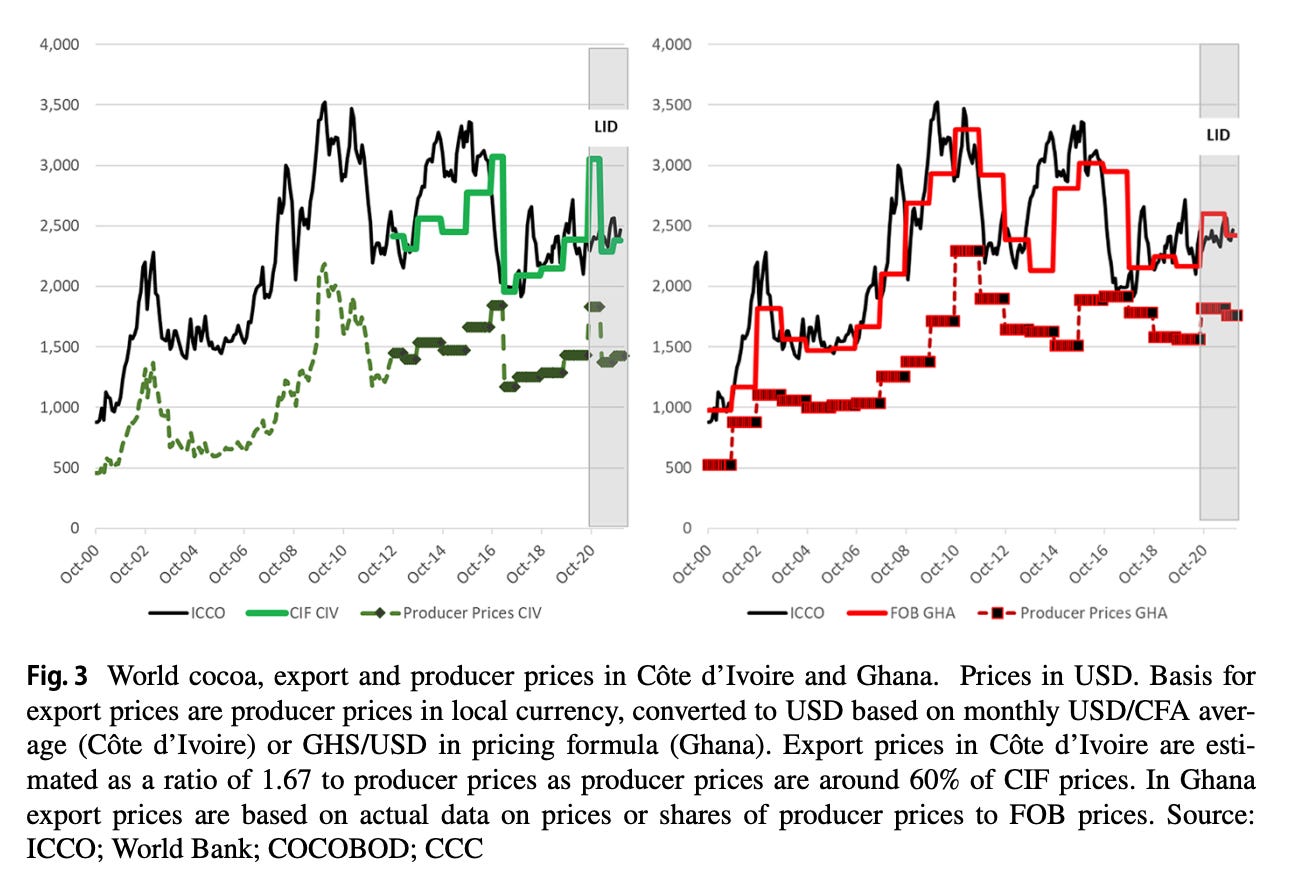 The global cocoa industry has thus reached a new concentrated organizational form, with the cocoa controls agencies of Ghana and CdI, facing off with a compact group of exporters. It is a highly unstable balance. Following the sudden slump in world prices in 2016-7, CdI and Ghana entered into high-level talks and in March 2018 signed the Abidjan Declaration. They agreed to adopt a common strategy to drive up producer prices. In June 2019 they set a common floor price for the 2020-21 season of 2,600 per ton of which farmers were to receive 70%, or USD 1,820 per ton. In the face of buyer resistance the CdI and Ghana backed down to agree instead that prices would be set as normal, but buyers would pay a premium of $400 per ton to support farm incomes and in the event that this did not yield at least $1820 per ton for the farmer, the price setting agencies in CdI and Ghana would cover the gap. In effect they declared a minimum price guarantee. It was a substantial risk for the buying agencies and one that was immediately exposed by the COVID crisis. Faced with tumbling world prices, in mid year 2021 the Ivorian CCC slashed the price for CdI farmers to $1350 per ton. Meanwhile the global buyers, having agreed pro forma to the $400 per ton levy in favor of the farmers, have now taken to cutting the country premiums they previously paid to Ghana and CdI.
