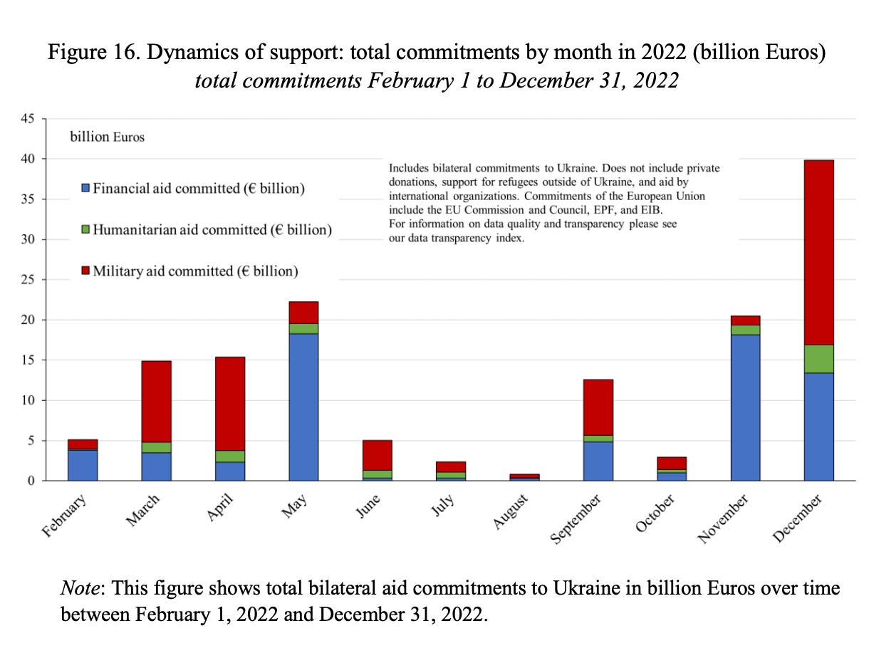 December 2022 - the 11th month of the war - saw the largest commitments of military aid to date. As Ukraine’s own reserves are progressively worn down, we should surely expect that trend to continue.