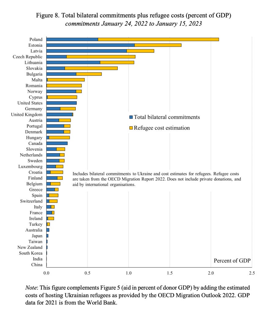 If you allow for the costs of supporting refugees, as well as military and other bilateral aid, Germany and the United States at 0.375 percent are both contributing similar shares of GDP. The leader, by far, is Poland, which at 2.1 percent of GDP is spending more than 5 times as much in proportional terms as either the US or Germany.