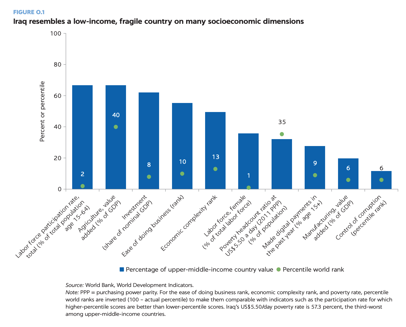 Although oil wealth has allowed Iraq to obtain upper-middle-income status, in many ways its institutions and socioeconomic outcomes more closely resemble those of a low-income, fragile country. The Iraqi education system once ranked near the top of the Middle East and North Africa (MENA) region, but it now sits near the bottom. Iraq’s rate of participation in the economy is also low, and the country has one of the lowest female labor force participation rates in the world, low levels of human and physical capital, and deteriorating business conditions. Iraq also has one of the highest poverty rates among upper-middle-income countries.