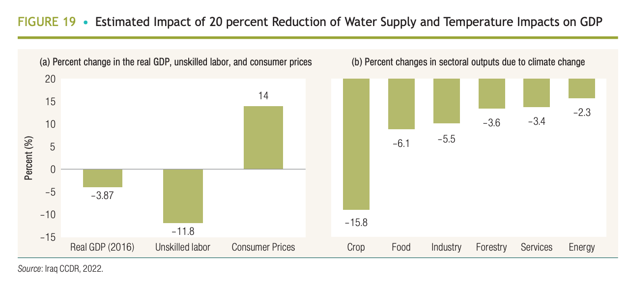 Reduced water availability and quality degradation impose significant risks on Iraq’s agri-food systems and hence on the ability to diversify the economy. Water scarcity negatively affects GDP and other sectoral outputs, including crops which lower the demand for unskilled workers. Extreme heat temperature adversely impacts (unskilled) labor productivity, which further intensifies the socio-economic challenges associated with climate change.