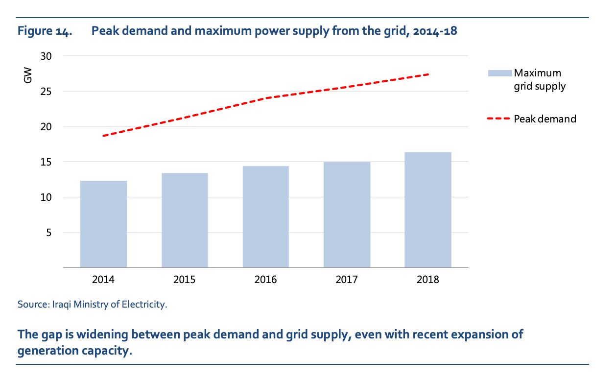 One telling area of crisis is Iraq’s dilapidated electricity supply. Despite being an energy producer of global stature, Iraq’s domestic power supply lags chronically behind demand. Blackouts and load shedding are a daily routine.