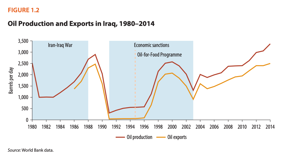 Amidst insecurity and chaos, Iraq was unable to profit substantially from the spectacular oil boom of the early 2000s. Despite sky-high prices it was only after 2010 that Iraq’s oil production exceeded the peaks of 1989 and 2002.