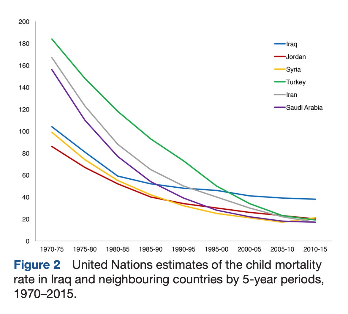 One powerful way to summarize the derailment of Iraq’s development is the rate of infant mortality, a basic measure of human welfare, sanitary conditions and medical provision. As Dyson Cetorelli 2017 argue, Iraq’s infant mortality data are contentious, having been instrumentalized by Saddam’s regime in the 1990s in the PR campaign against sanctions. But the following data paint a grim enough picture.