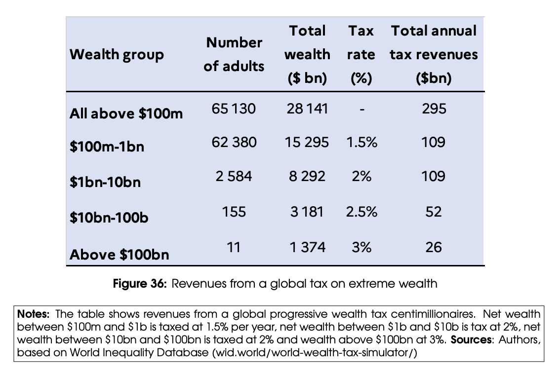 What is the solution? Chancel et al come from the “Piketty school” of inequalities studies, which has long favored a global wealth tax. They propose a modest 1.5 to 3 percent tax on global wealth starting at $100 million. According to their calculations this would yield $295 billion per annum.