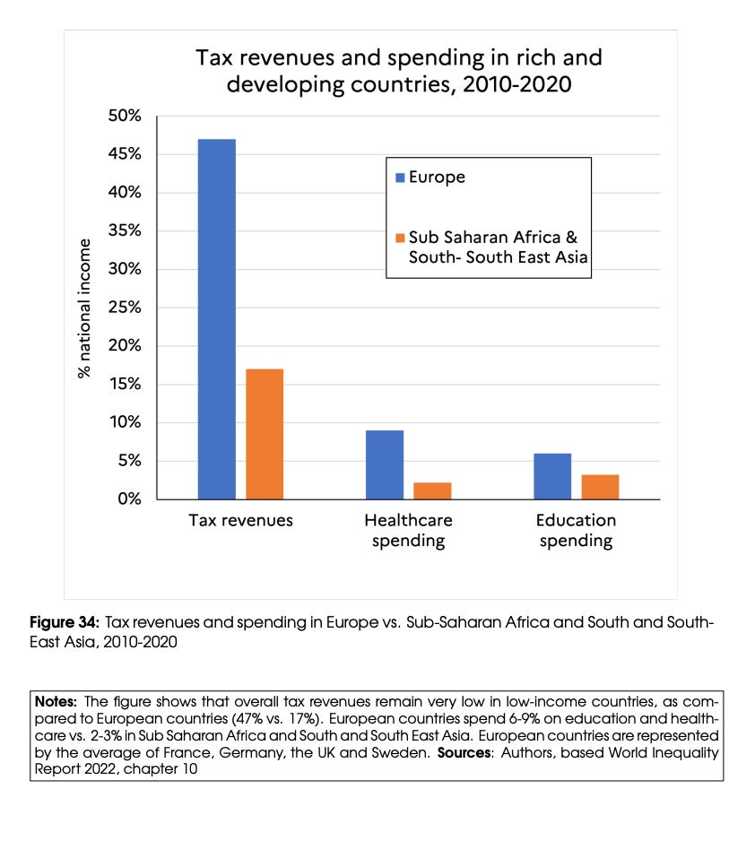 When it comes to remedies to address the crisis, Chancel et al are forthright. The resources are all stacked on the side of those least badly affected by the crisis and most responsible for it. The flow of funding from the rich countries to the developing world are notoriously inadequate. Capital markets prefer rich countries and extract a painful spread from lower income borrowers. This interesting chart shows the stark disparity in taxing capacity between Europe and African states.