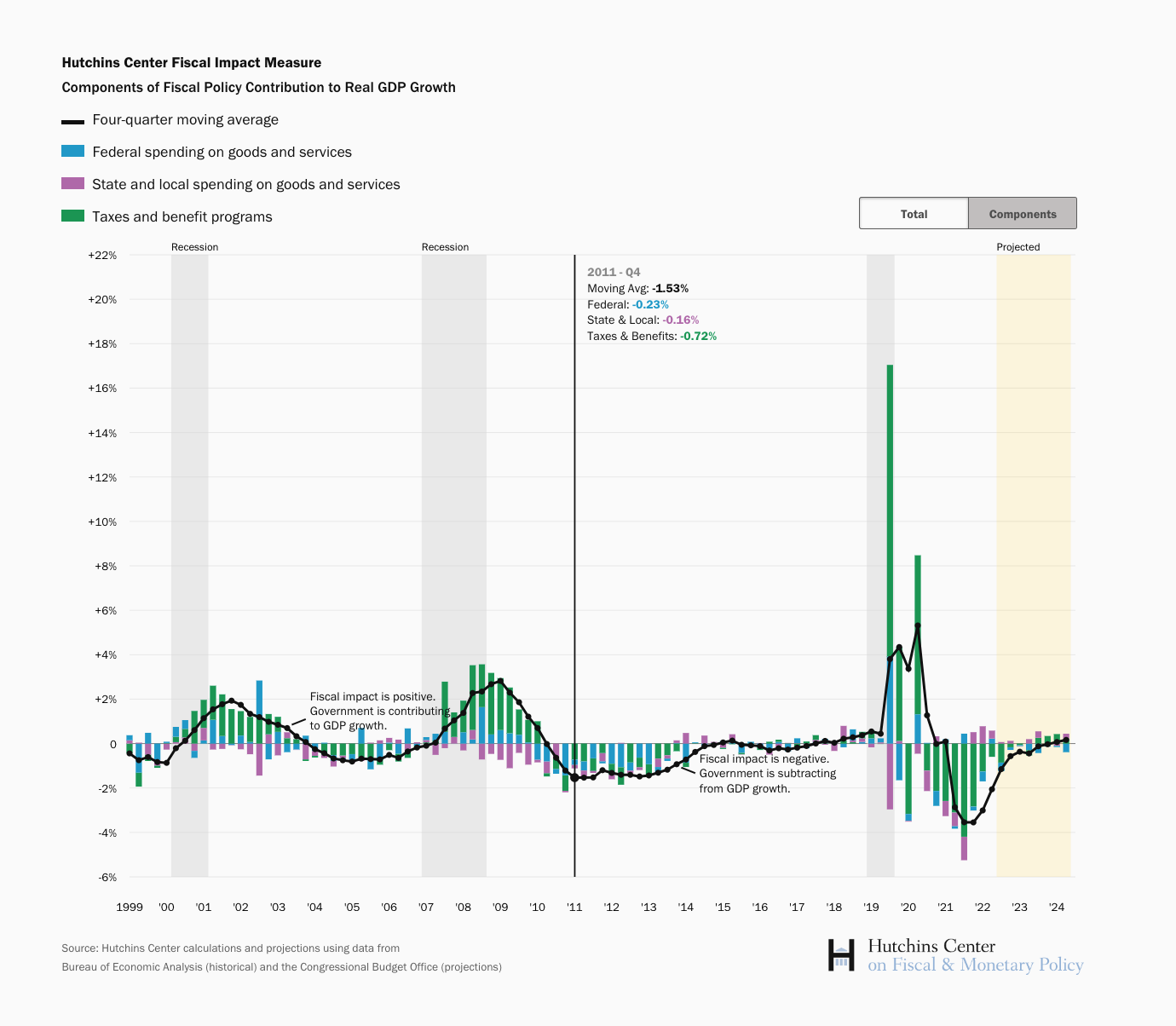 On the other hand we have the estimates from Eli Asdourian, Nasiha Salwati, Louise Sheiner, and Lorae Stojanovic at the Hutchins Center at the Brookings institution which show that since the drama of 2020 and 2021, fiscal policy has moved towards a neutral setting.