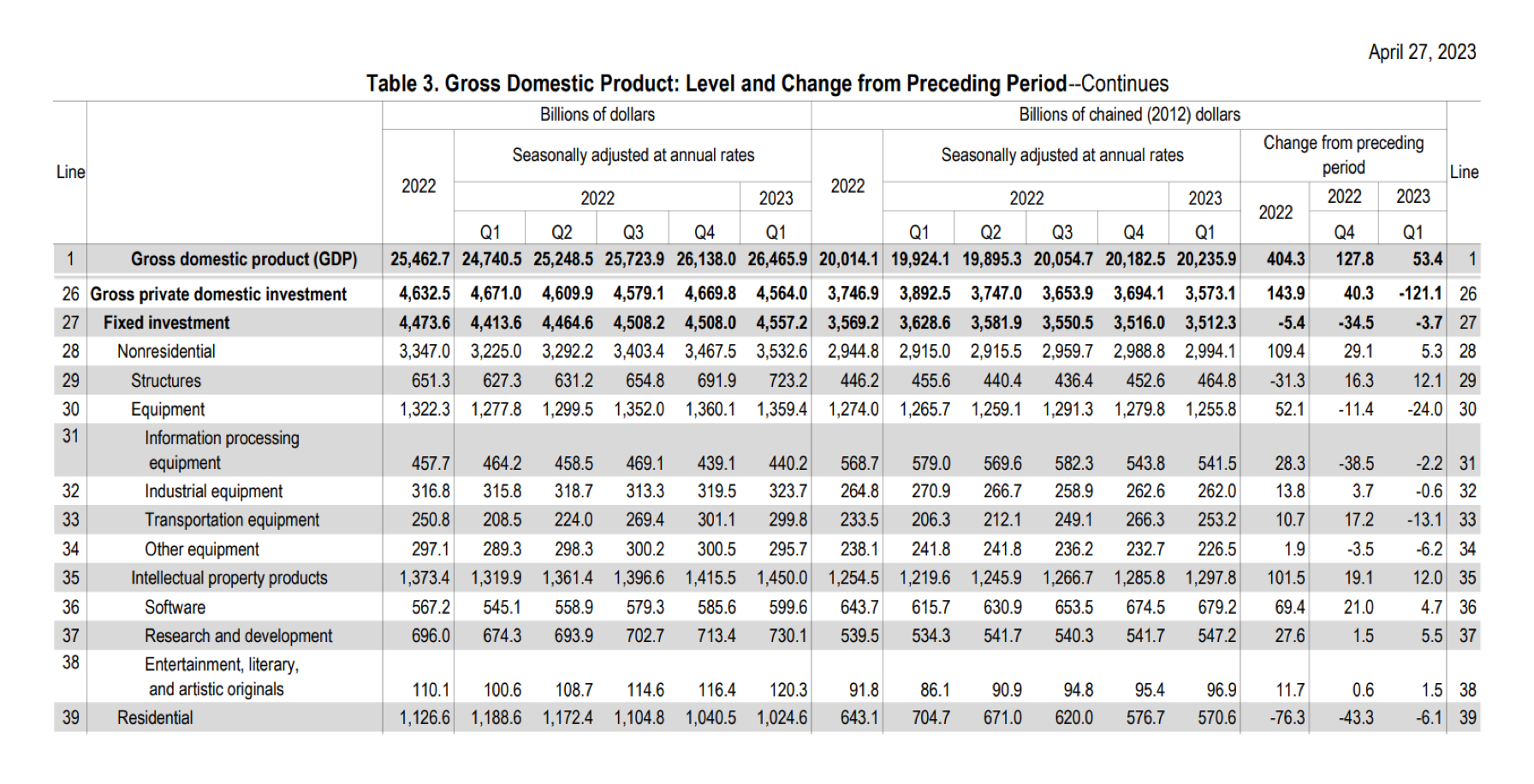 The story turns completely around if we move from nominal figures to investment measured in constant dollars. In inflation-adjusted terms, total investment in structures is up only 5 percent. Equipment investment is down. And Gross Private Domestic Investment in the first quarter of 2023 is down by 5 percent in real terms.