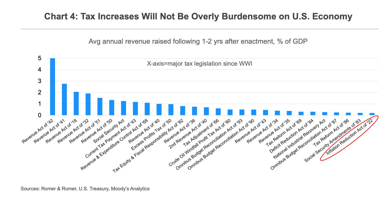 The DNB’s Scenario 2 involves an increase in corporate taxation to pay for the IRA tax breaks. But as Moody’s points out, in historic terms the IRA ranks low amongst tax measures reeform measures.