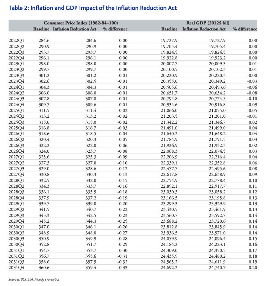 The first macroeconomic evaluation of the IRA I’ve been able to find, that by Mark Zandi’s team at Moody’s Analytics from August 2022, arrived at very modest totals for both the GDP and inflation impact.