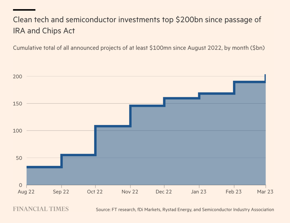 These numbers are consistent with project-level data compiled by Amanda Chu at the FT. As of April 2023 this came to $139 billion in announced projects for semiconductors and $65 billion for clean energy.