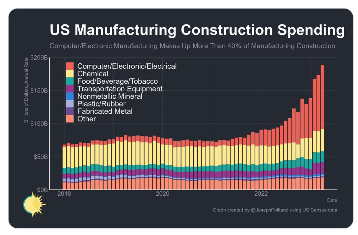 This is, no doubt, a dramatic picture. There has been a huge surge in construction in the exorbitantly capital-heavy microchip sector. This has ben supported by a smaller step-up in investment in transportation equipment, presumably in the battery and EV segment.