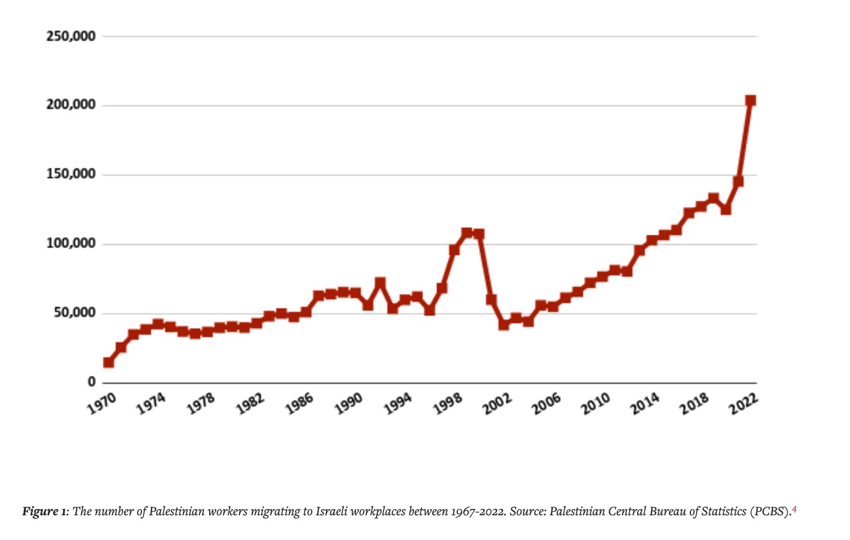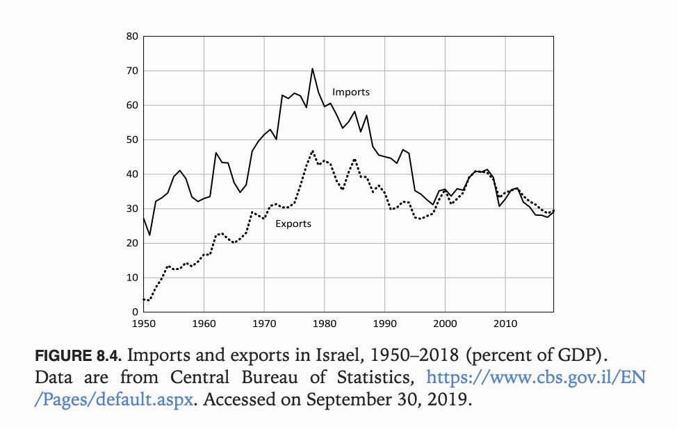Again contrary to the familiar narrative, a striking feature of Israel’s early decades was the country’s openness to economic flows of all kinds. As it expelled the Palestinian population, it absorbed a huge influx of Jewish migrants. The expanding settler colonial society sucked in foreign goods and it financed the resulting trade deficit by foreign funding, starting with reparations paid by West Germany. Israel today - in the much-vaunted age of globalization - is, in proportional terms, less open to the world economy than it was in the 1960s, above all because its imports were then much larger as a share of GDP.
