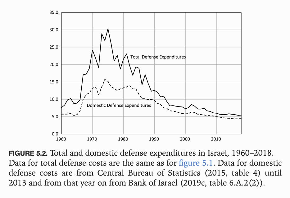 Given the scale of Israel’s victory in 1967, it was clear that the Arab world would react and that Israel must prepare to defend its huge territorial gains. Israel was built on war - in 1948 and 1956. But from 1967 onwards military spending surged to unprecedented levels and after the shock of 1973 it continued at extraordinarily high levels. At its peak defense spending amounted to 30 percent of GDP with half of that coming in the form of defense imports. With that kind of burden, macroeconomic imbalance is more or less inevitable.