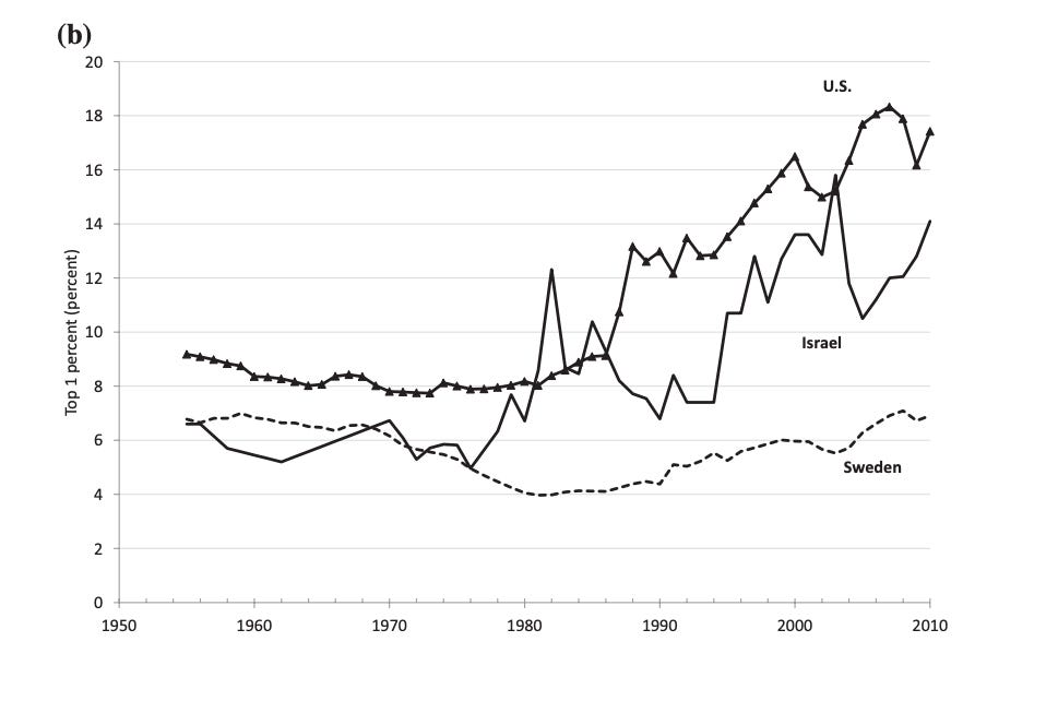 The imported goods and labour was put to good use. Under the social democratic model, anchored in the Labour party, kibbutz, organized labour movement and state-owned industry, Israel experienced dramatic agricultural and urban development. In addition, one of the defining feature of Israel’s political economy in its first decades was equality. By the 1970s, Israel had one of the lowest Gini coefficients in the world. The share of income going to the top 1 percent was as low as that in Sweden. Today it is almost as high as in the United States.