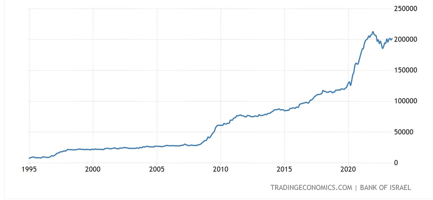 If Israel’s right-wing from the late 1990s onwards saw no realistic prospect of a true Two-State solution, then they needed to be prepared to uphold an apartheid regime if necessary against outside pressure. That would require Israel to secure its independence from its friends as well as its enemies. That meant putting a premium on reducing Israel’s current account deficit and enhancing its resilience in the face of outside shocks. From a country of chronic trade deficits, dependent on external funding, Israel from the mid 1990s onwards turned itself into a country of current account surplus, whilst progressively accumulated an ever larger war chest of foreign reserves.