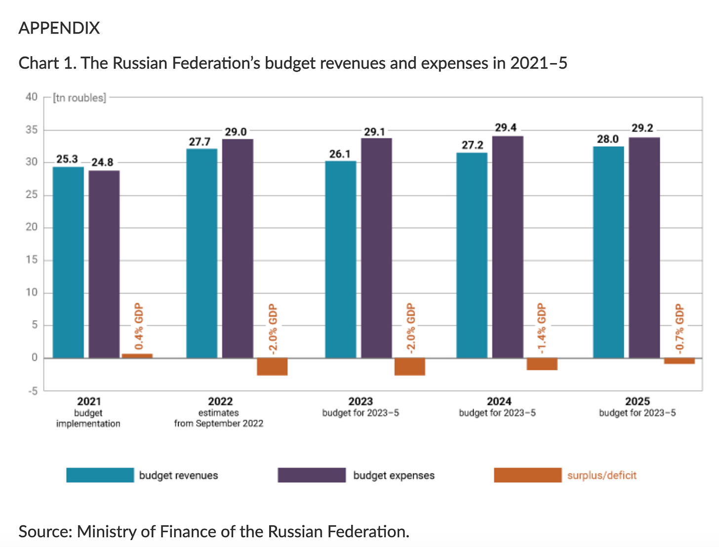 It is enough, in any case, to give a healthy boost to many sectors of Russian industry and to aggregate demand overall. If we take Russian budgetary figures at face value, Russia’s economy is feeling the effects of shifting from a fiscal surplus in 2021 of 0.4 percent of GDP, to a deficit in 2022 and 2023 of 2 percent of GDP.