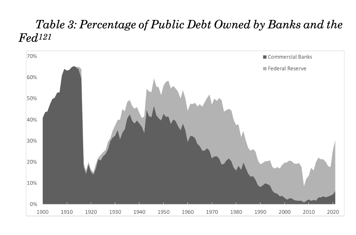 Between 1863 and 1916, Congress established a network of investor-owned federal corporations—national banks—to serve as the country’s primary money-issuing institutions and required that these instrumentalities back their paper notes with Treasuries. … In doing so, the federal government conjured captive demand for federal debt. Although, under the resulting legal regime, the government formally borrowed to manage deficits, it borrowed in significant part by selling Treasuries to national banks, which, in turn, funded their purchases with newly issued notes and deposits.