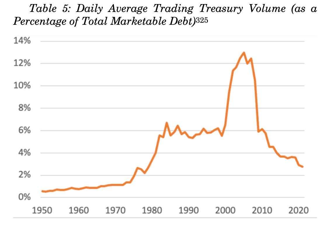The ability of investors to sell Treasuries quickly, cheaply, and at scale has led to an assumption, in many places enshrined in law, that Treasuries are nearly equivalent to cash. Yet in recent years Treasury market liquidity has evaporated on several occasions and, in 2020, the market’s near collapse led to the most aggressive central bank intervention in history. … a high degree of convertibility between Treasuries and cash generally requires intermediaries that can augment the money supply, absorbing sales by expanding their balance sheets on both sides. The historical depth of the Treasury market was in large part the result of a concerted effort by policymakers to nurture and support such balance sheet capacity at a collection of non bankbroker-dealers. In 2008, the ability of these intermediaries to augment the money supply became impaired as investors lost confidence in their money-like liabilities (known as repos). Subsequent changes to market structure pushed substantial Treasury dealing further beyond the bank regulatory perimeter, leaving public finance increasingly dependent on high-frequency traders and hedge funds—“shadow dealers.” The near money issued by these intermediaries proved highly unstable in 2020. Policy makers are now focused on reforming Treasury market structure so that Treasuries remain the world’s most liquid asset class. Successful reform likely requires a legal framework that, among other things, supports elastic intermediation capacity through balance sheets thatcan expand and contract as needed to meet market needs.”