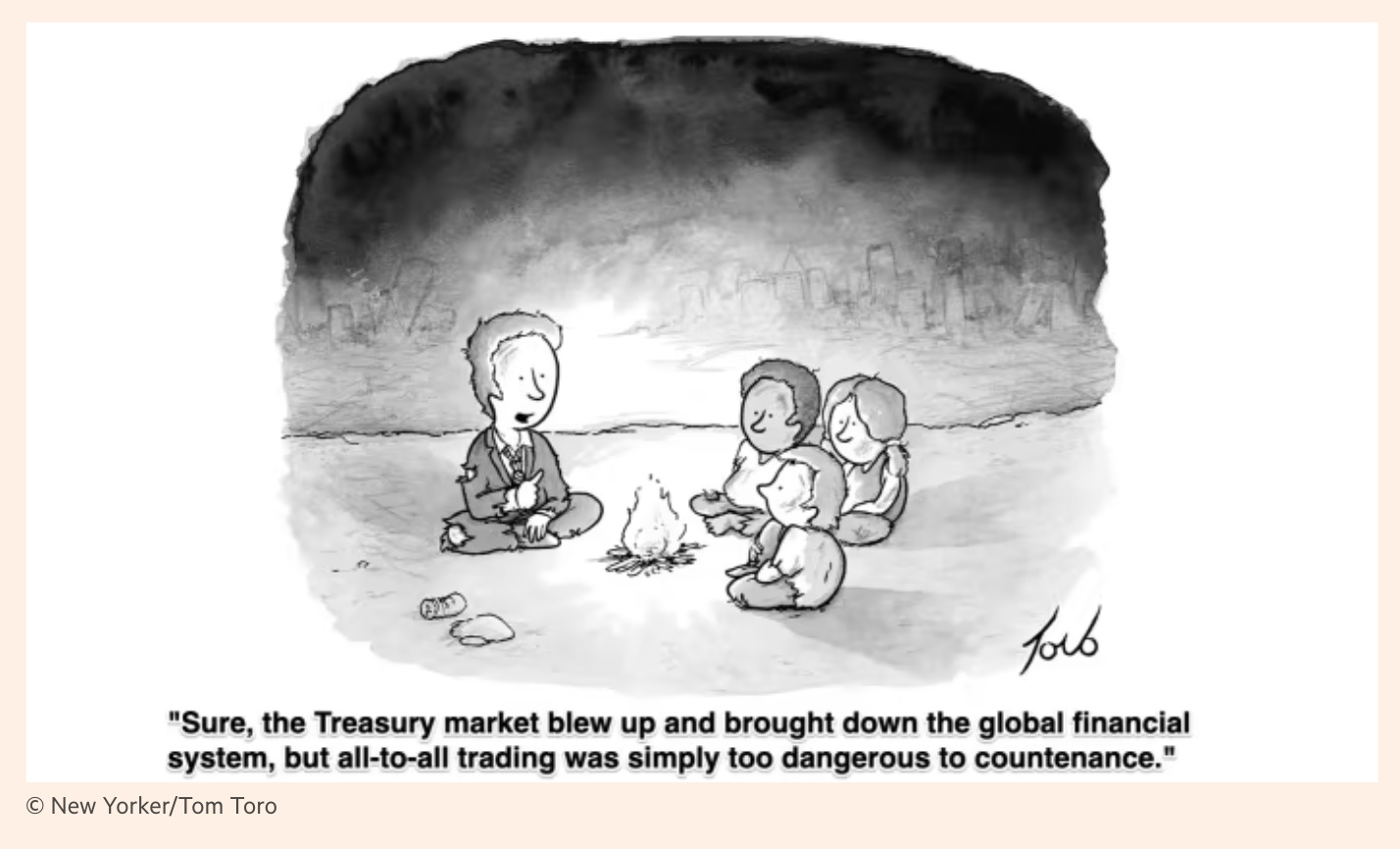 … in 2020, the onset of the pandemic revealed that shadow dealers, which were often much more thinly capitalized than commercial banks and lacked explicit or implicit access to central bank backstopping, were extremely vulnerable to run-like dynamics in the face of market volatility. Just when private intermediaries, including hedge funds and high-frequency traders as well as securities dealers, were most needed to warehouse a deluge of sales by end-investors in a largely one-sided market, these firms stepped back in unison.