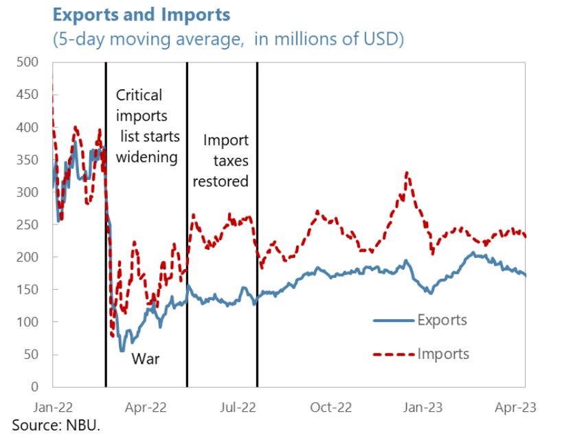 A “twin deficit” - both in the government account and on the foreign trade account - on the scale seen in Ukraine in 2022 is symptomatic of a country on the edge of a doom-loop of macro-financial crisis. For much of 2022 it was fueled by Kyiv’s resort to monetary financing to cover the budget deficit. Rather than taxing or borrowing in stable ways either at home or abroad, Kyiv was effectively monetizing deficits with the central bank. That depreciated the currency, which in the short-run pushed the price of imports up, exacerbating inflationary pressures.
