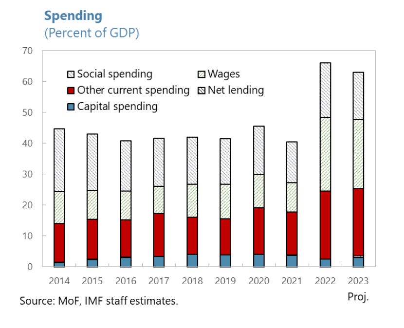 At the same time as spending surged, in 2022 GDP collapsed. The result was to drive government spending as a slice of the smaller economy from 40 to 66 percent.