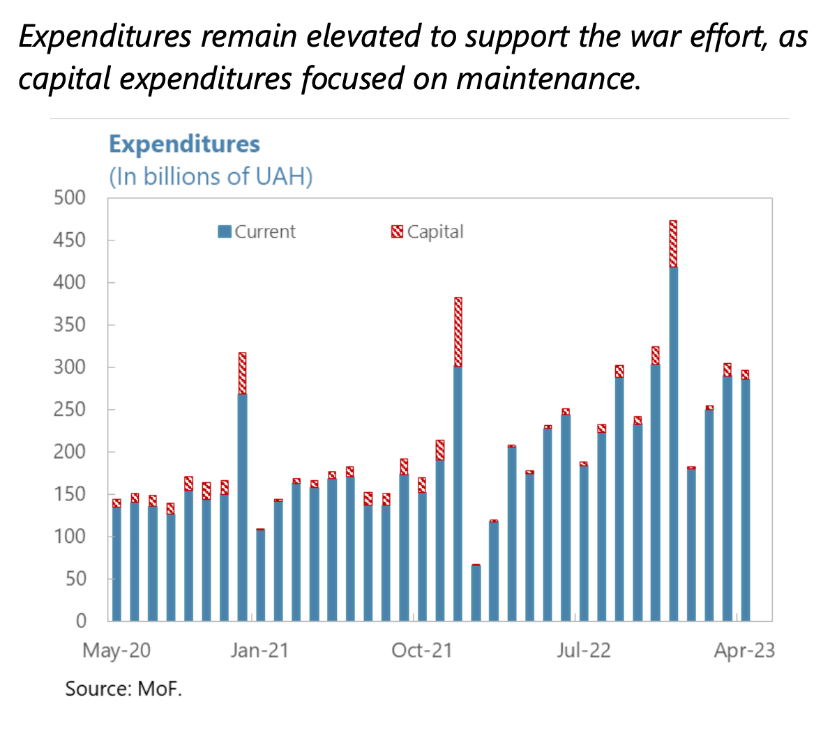 The war has not only disrupted normal economic activity, it has also forced a dramatic mobilization of resources in the hands of the state. This is seen in figures for state spending. These are not broken down in detail, but they show a step change from a prewar level of around 150 UAH per month to a current level, which fluctuates between 250 and 300 UAH per month.