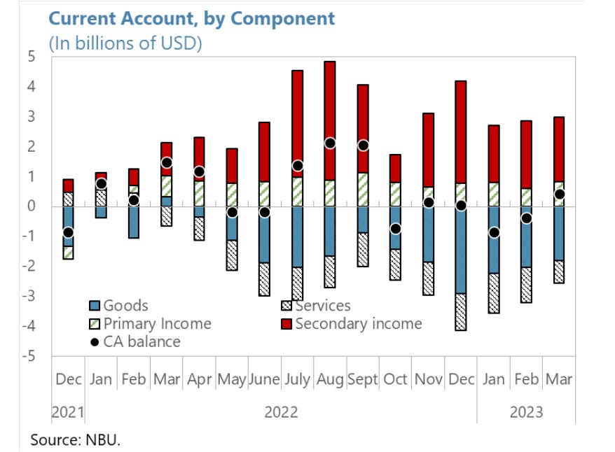 You can see this in the current account data, where the red bar for “secondary income” records foreign financing of the Ukrainian war effort in its external account.