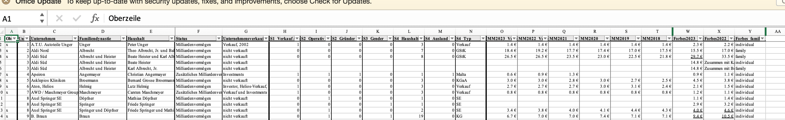 The unprecedentedly comprehensive investigations by Jirmann and Trautvetter have added 11 fortunes to the Manager list, for a total of 237 billionaire family fortunes in Germany. More significantly they have raised the estimate of their total wealth from the 900 billion previously identified by Manager Magazine to somewhere between 1.4 and 2 trillion euros. You can download the excel spreadsheet here.