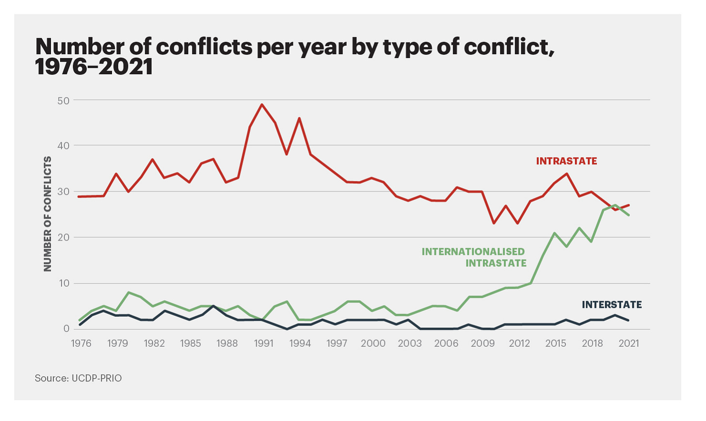 The anecdotal evidence that war is surging round the world is confirmed by the numbers. A recent report by the International Institute for Strategic Studies documented 183 ongoing conflicts around the world, the highest number in more than three decades. And that figure was arrived at before the outbreak of the war in Gaza.