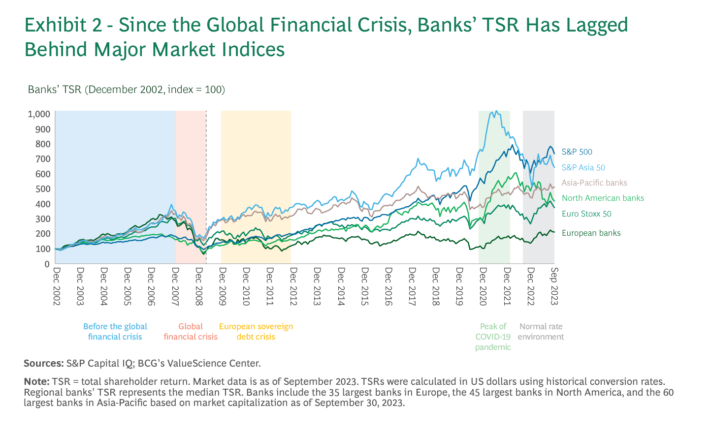 Banking is a tough business. Europe’s banks are not alone in facing uncomplimentary stock market valuations. As a recent sudy by Boston Consulting shows East Asian banks are even more undervalued than those in Europe. But compared to their US counterparts, European banks are hugely depreciated.