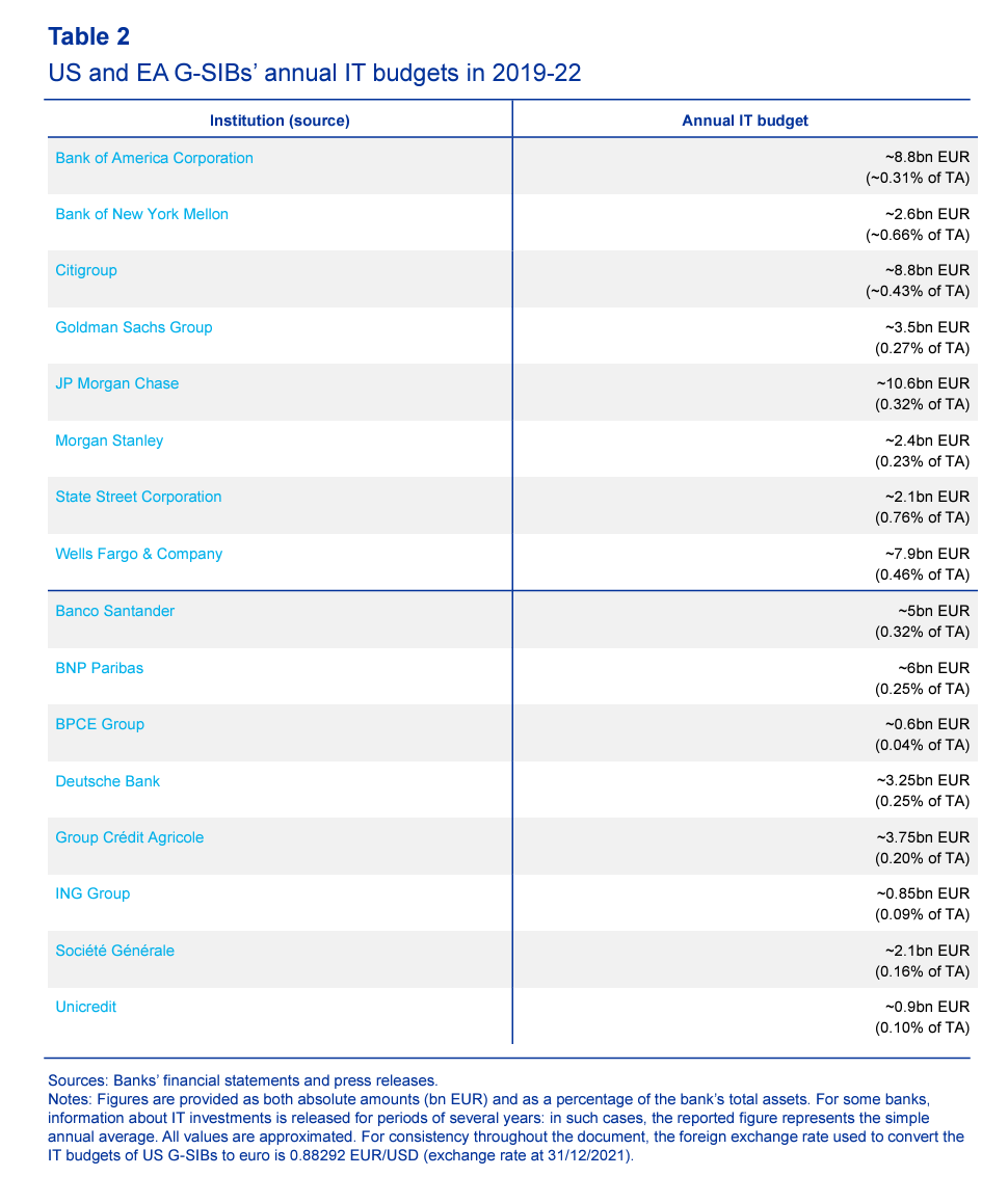 IT holds the key to the future of 21st-century banking. According to the ECB’s analysts the IT investment of America’s top 8 megabanks exceeded that of their 8 largest European counterparts by 46.7bn EUR to 22.5bn EUR.