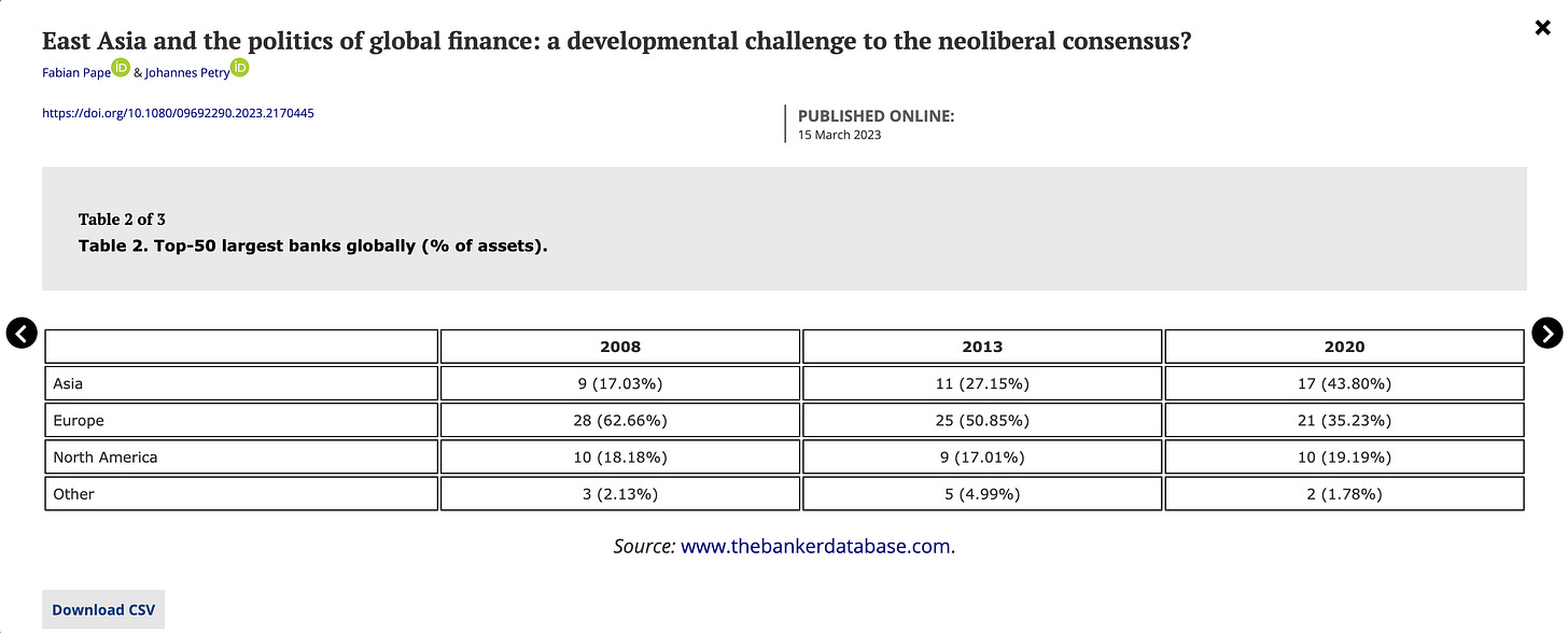 According to BIS analysis, what could be taken for general deglobalization of finance after 2008 was actually a more specific shock. It was the Europeans that deglobalized. Neither American nor Asian banks retrenched. As a result, the biggest emerging market banks, notably those in China and India, now tower above their European competitors.