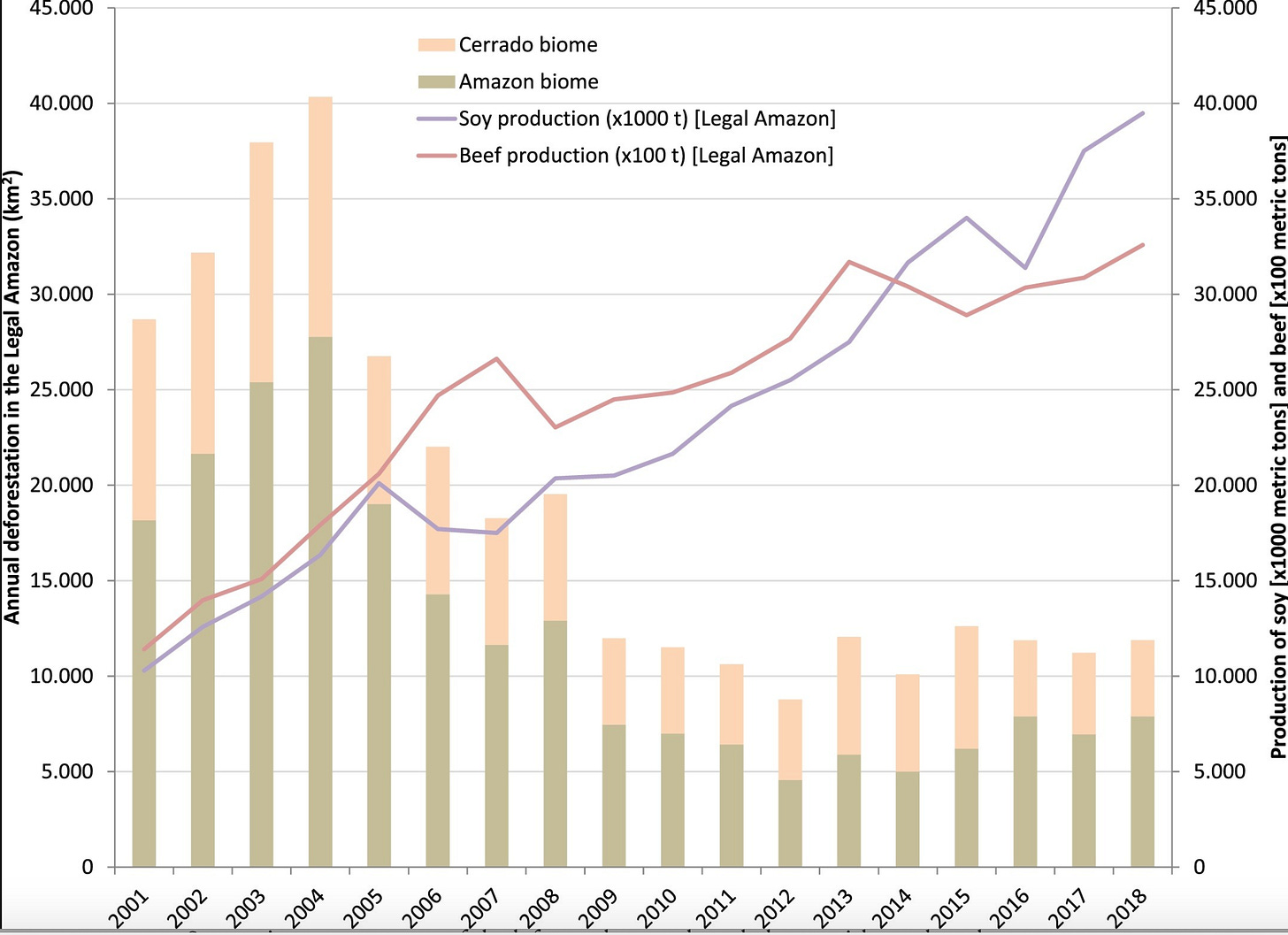 Any inherent relationship between Amazon deforestation and Brazil’s agricultural boom is denied by reference to the experience of the 2000s. As they point out, at the moment that Brazil’s agricultural output surged Lula’s governments was succeeding in suppressing illegal deforestation.
